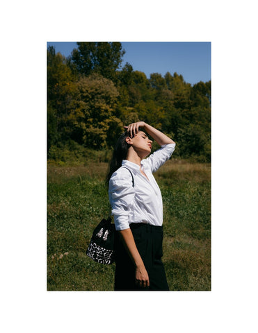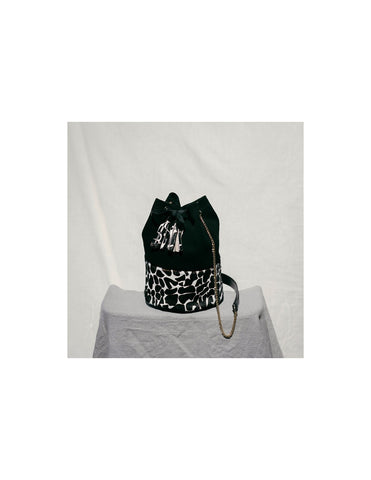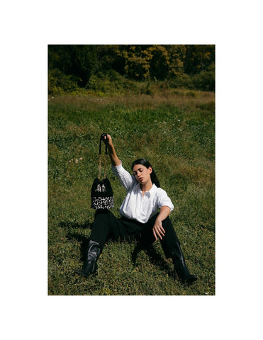 Confeccionado en piel serraje negro y pelo con print de jirafa en blanco y negro. Las terminaciones metálicas son de latón dorado.
