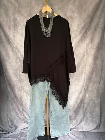 Sudadera larga de tejido fino, corte asimétrico. Con detalle de encaje en color negro . Talla única .