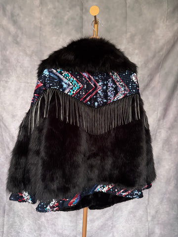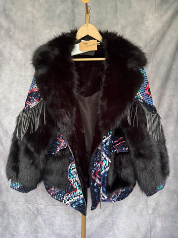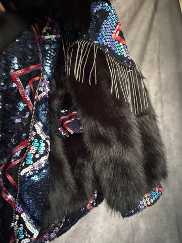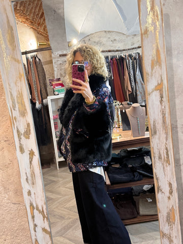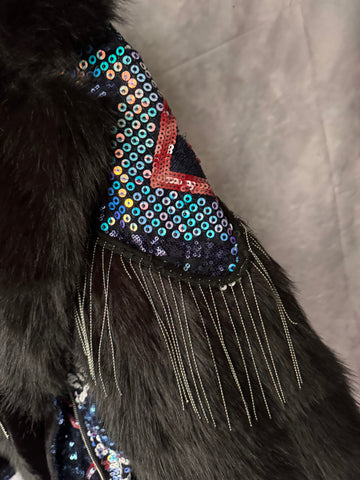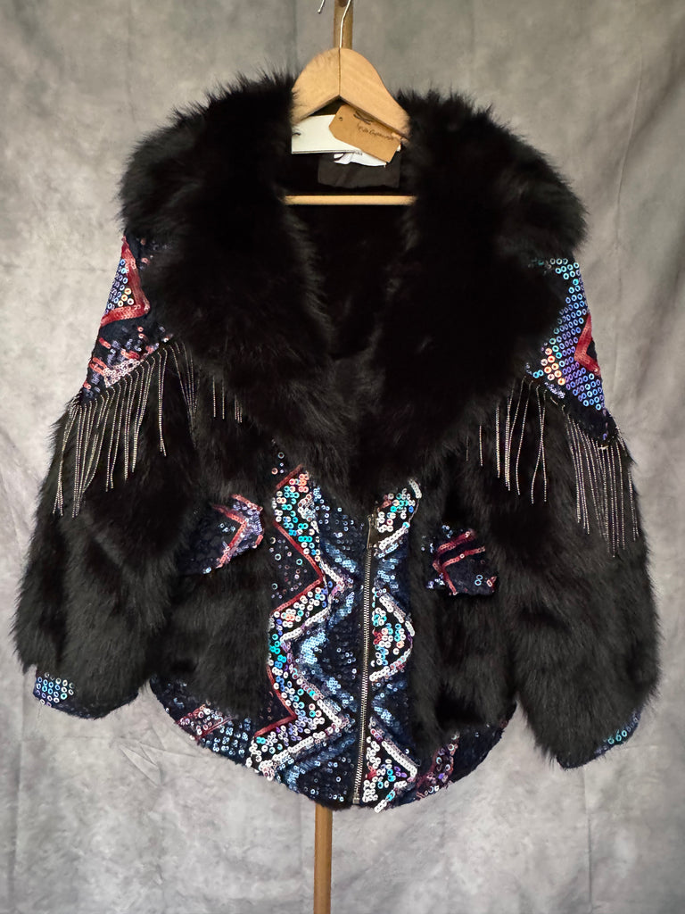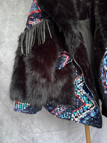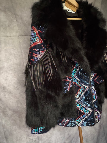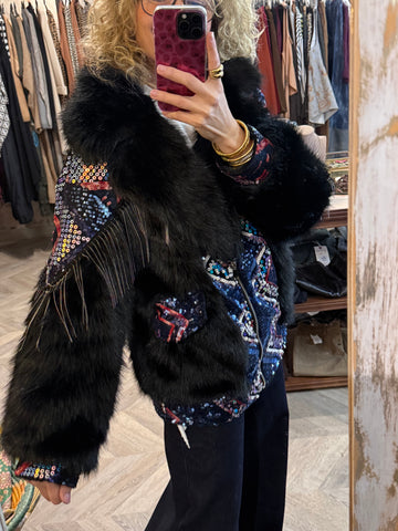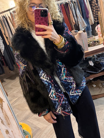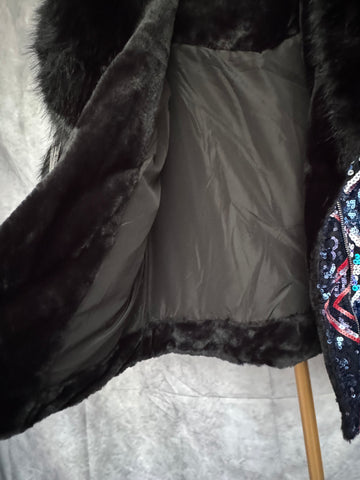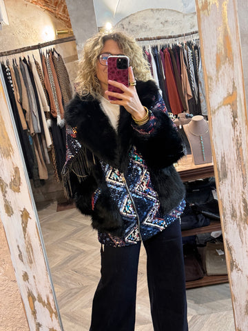 Cazadora pelo sintético en color negro . Amplias solapas . Con bolsillos . Detalles de lentejuelas de colores y cadenas finas metálicas .Cierre con cremallera . Con forro .
