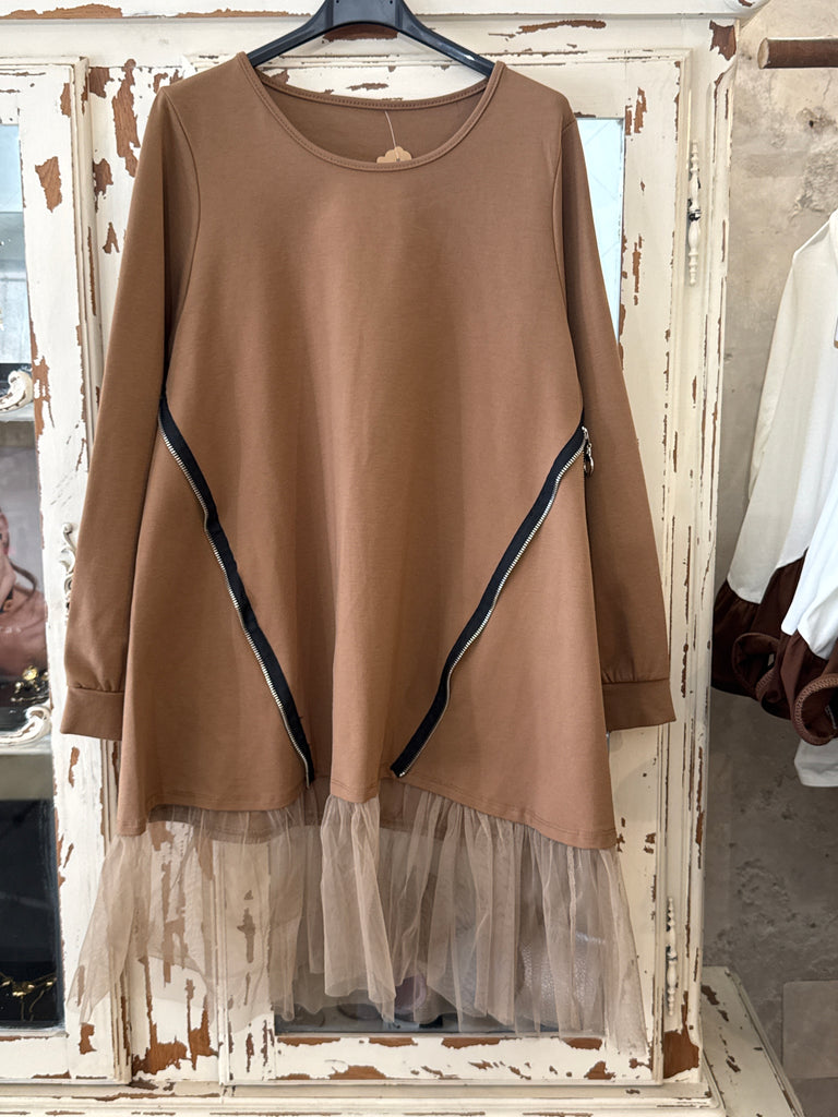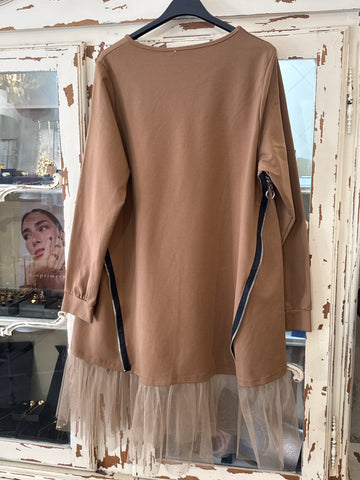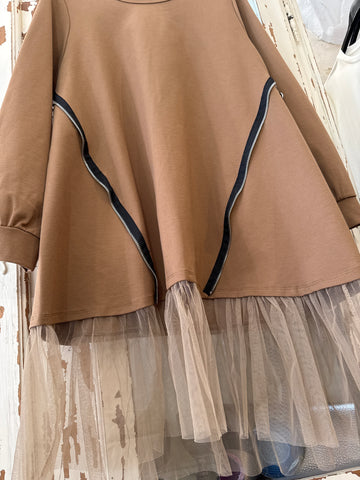 Sudadera larga en color marrón con detalles de cremalleras y tul .