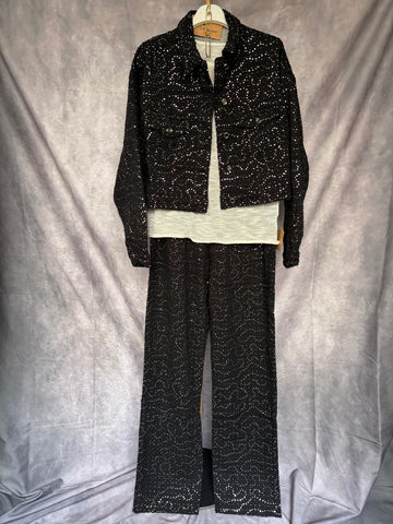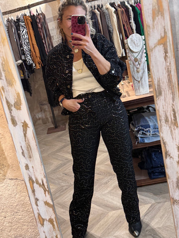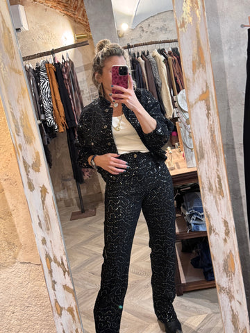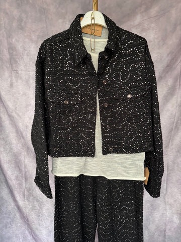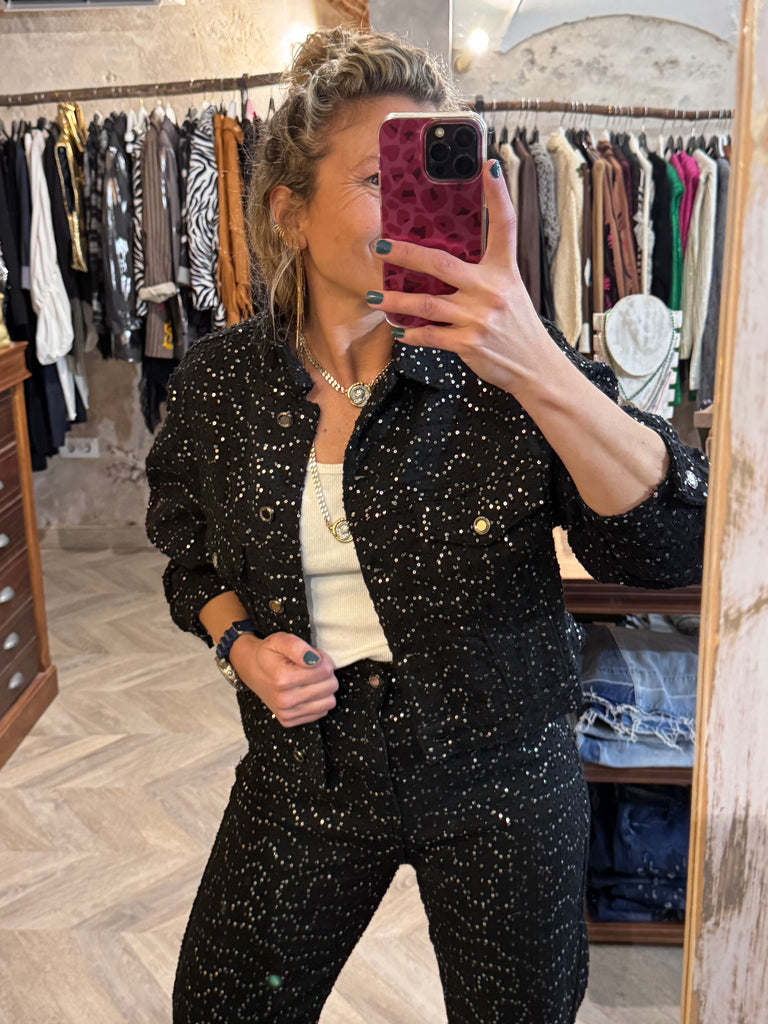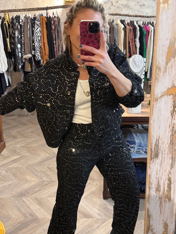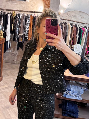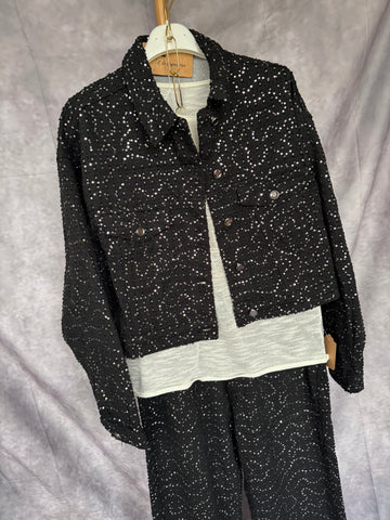 Cazadora vaquera negra con lentejuelas plateadas. Con forro.
