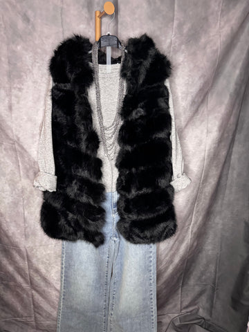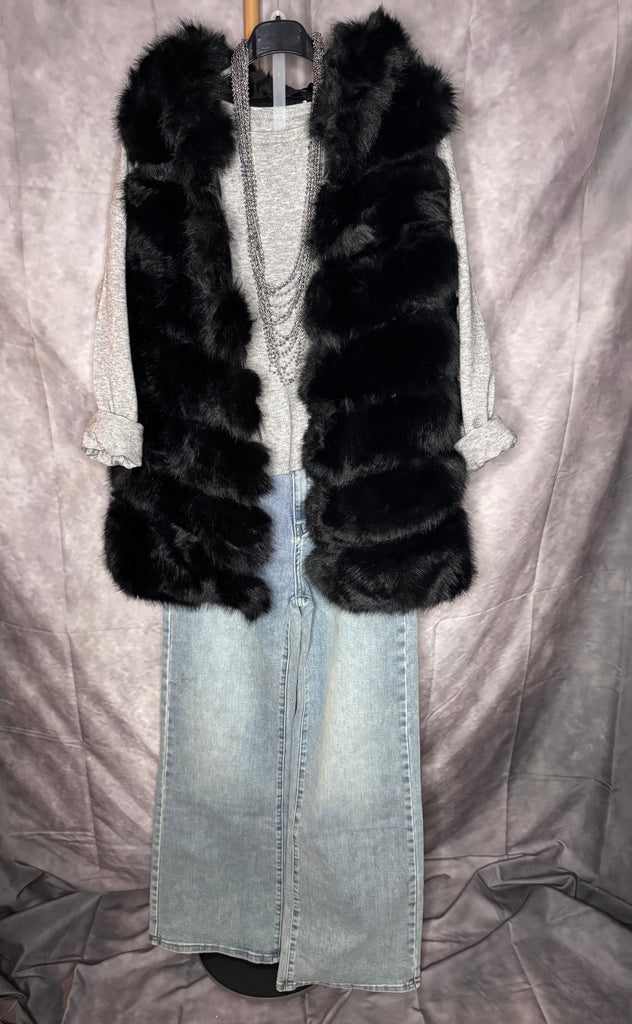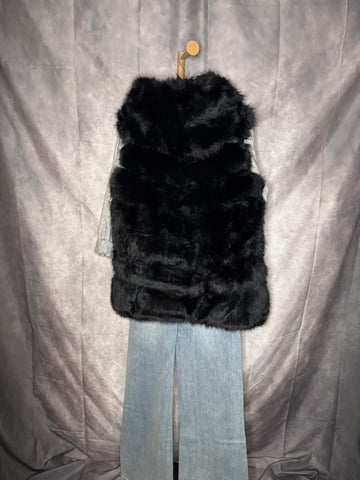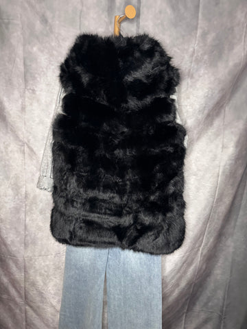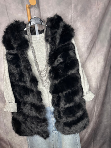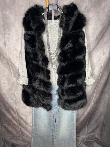 Chaleco con capucha de pelo sintético en color negro . Con bolsillos .