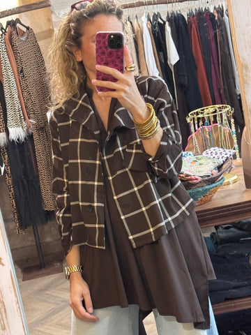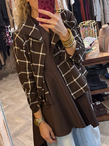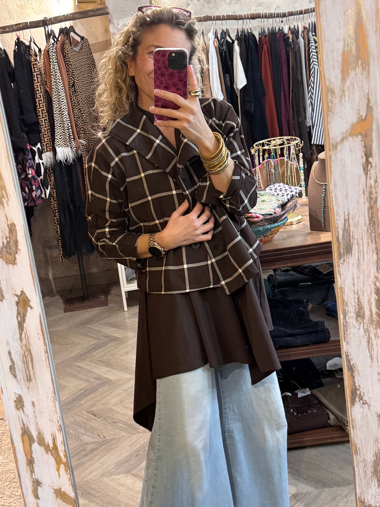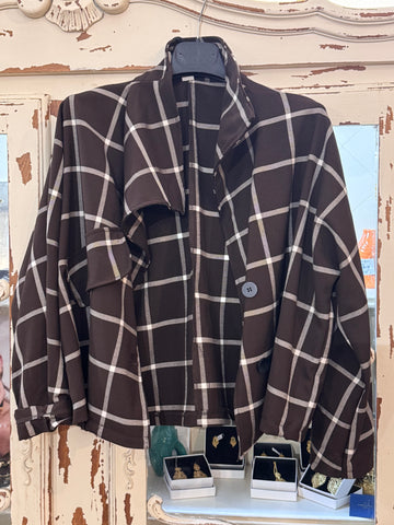 Chaqueta corta marrón con cuadros blancos .
