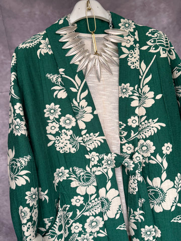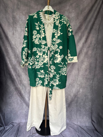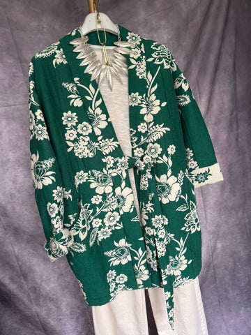 Chaqueta corte kimono . Estampado verde con flores blancas . Cierre con lazo estilo japonés .