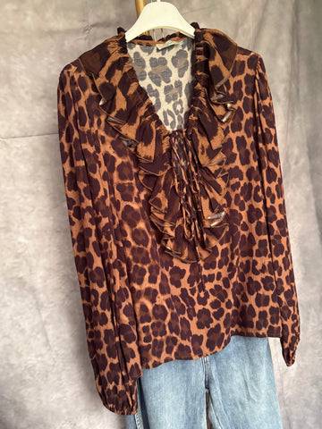 Camisa fluida animal print . Escote con volante y cordón . Mangas con elástico . Talla única .