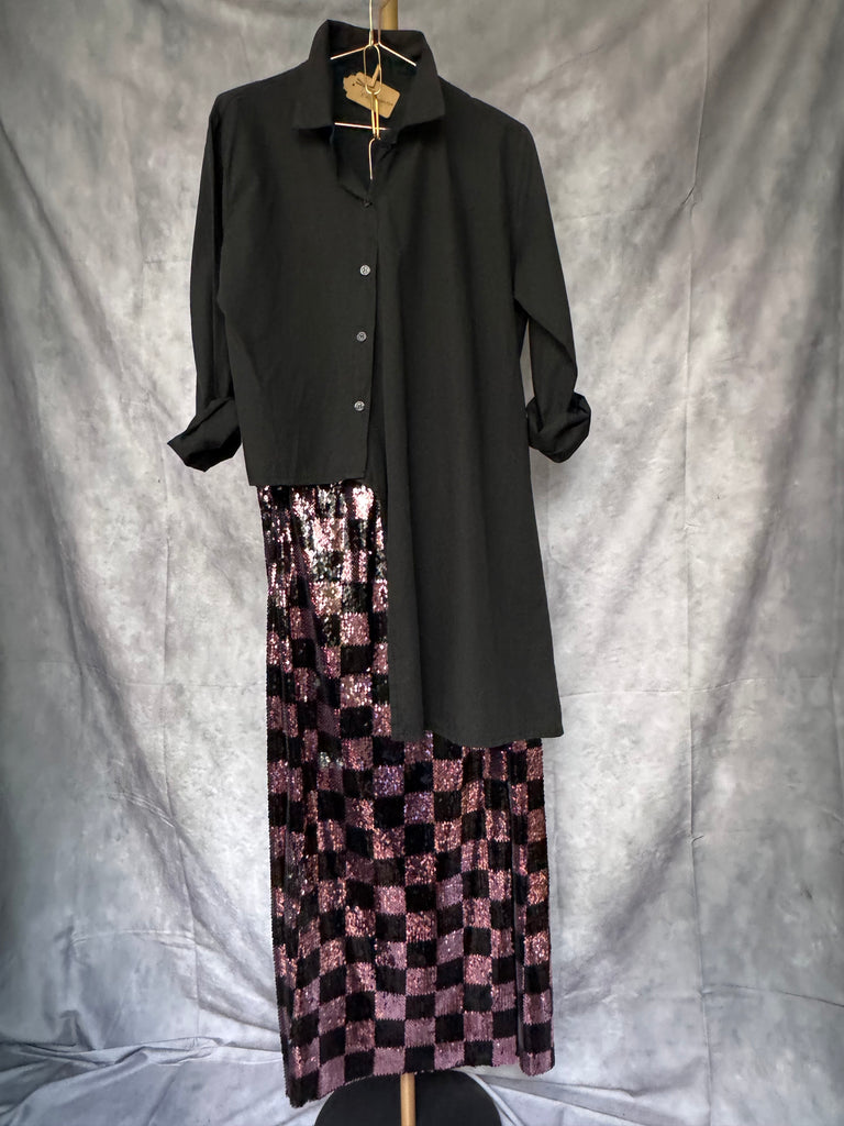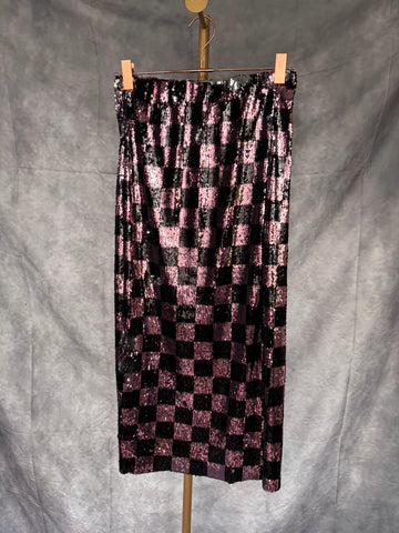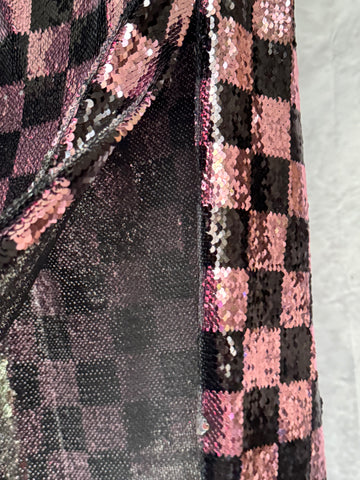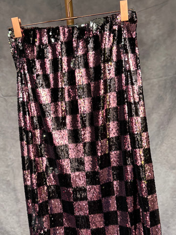 Falda recta de lentejuelas a cuadros rosas y negros . Cintura con elástico .