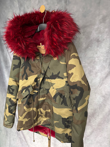 Parka estampado camuflaje con capucha de pelo sintético . Cierre doble con cremallera y corchetes. Cuerpo forrado con pelo sintético del mismo color.