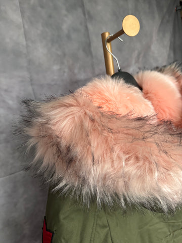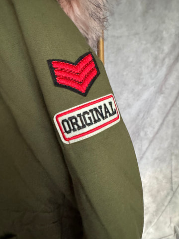 Parka verde con parches con capucha de pelo sintético . Cierre con cremallera y botones. Cuerpo forrado con pelo sintético del mismo color. Remate de pelo sintético extraible .