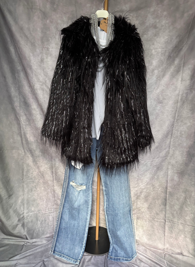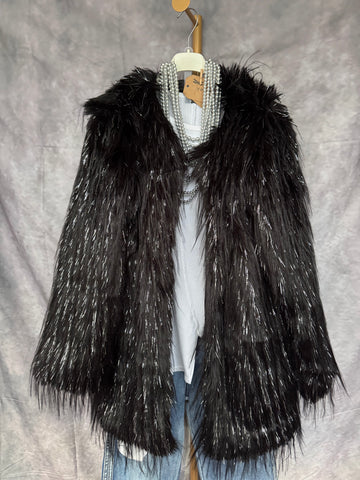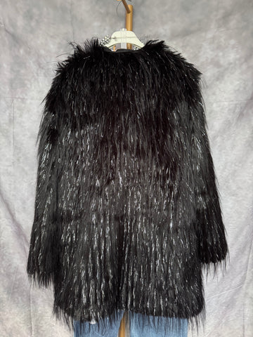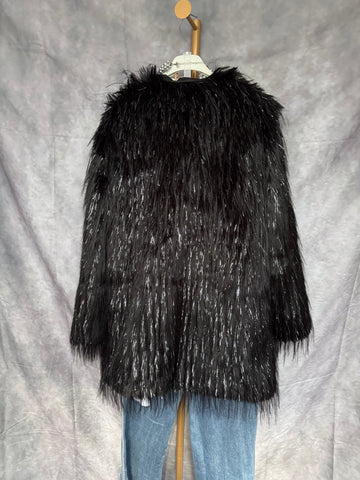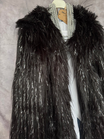 Abrigo de pelo sintético en color negro con brillos plateados . Con bolsillos.