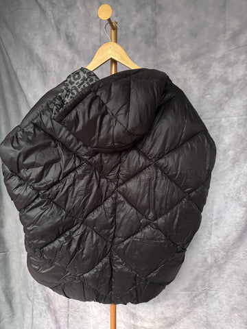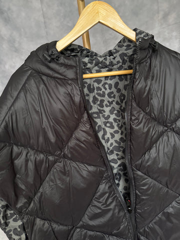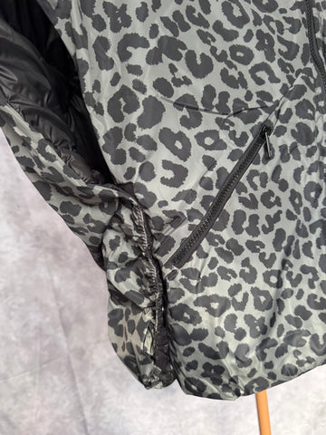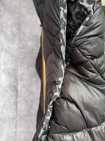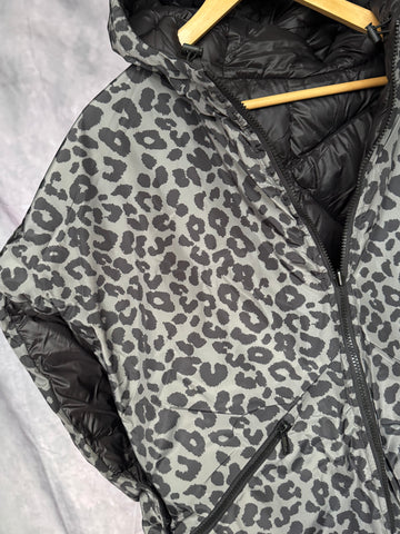 Anorak sin mangas reversible. Por una lado en color negro y por el otro animal print en tonos grises . Corchetes en los laterales para convertir en pocho .Corte amplio .Con bolsillos.