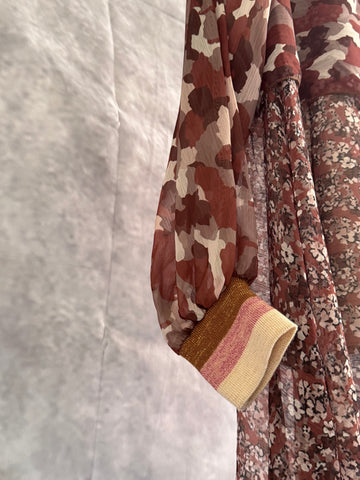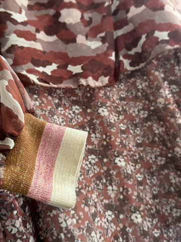 Blusa mezcla de estampados militar y flores . Mangas con elástico en lurex . Con forro