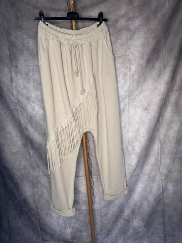 Pantalón baggy con flecos .Tejido tipo sudadera.Cintura elástico . Con bolsillos.