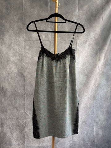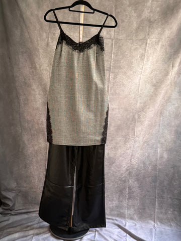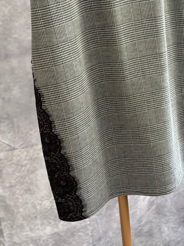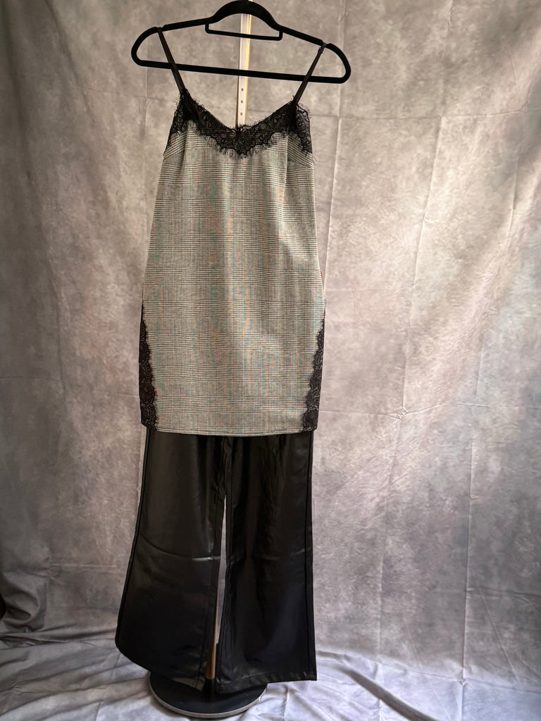 Top lencero largo ,  estampado príncipe de Gales con encaje en color negro . Tirantes regulables .