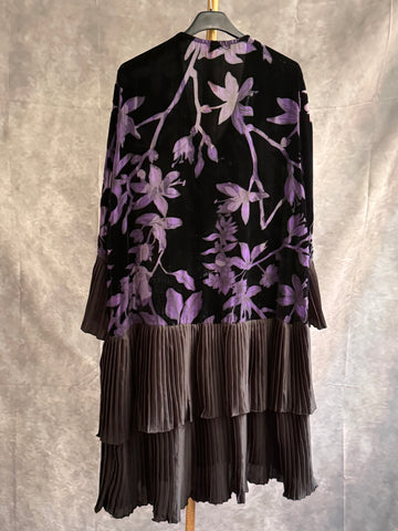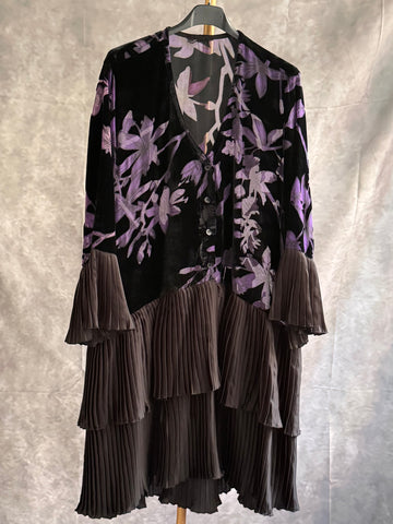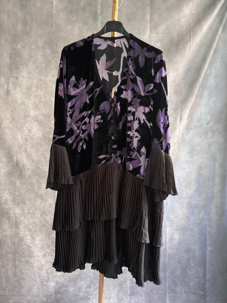 Vestido corto mezcla de terciopelo y transparencias. Pliegues en mangas y bajo .