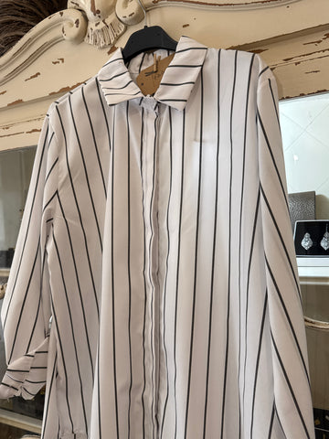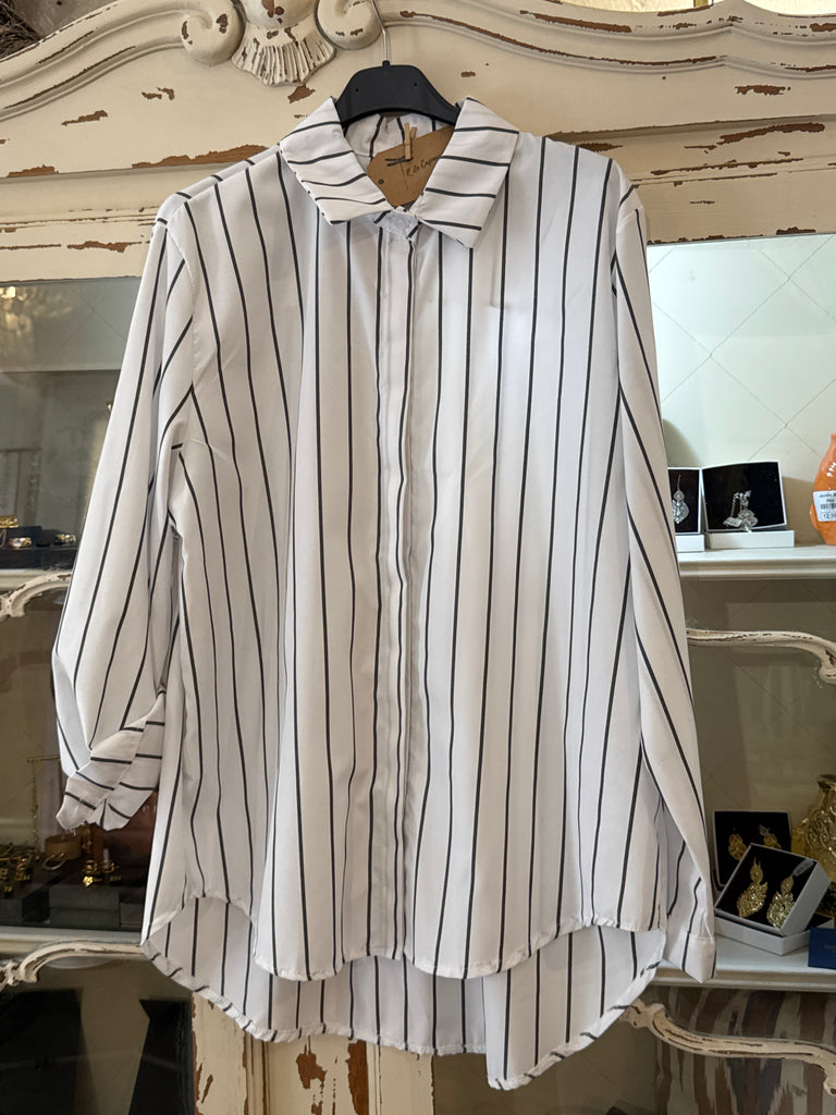 Camisa blanca con rayas negras . Más larga por detrás .Talla única .