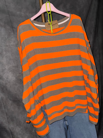 Sudadera oversize de rayas en color naranja y gris . Tejido fino para primavera . Con aberturas en los laterales.