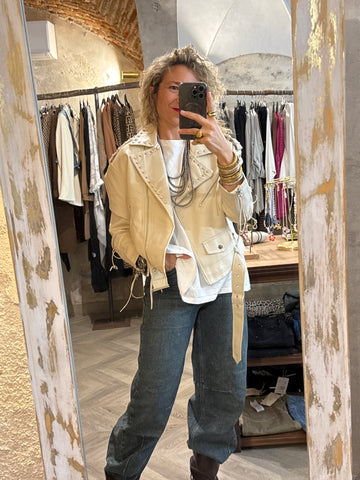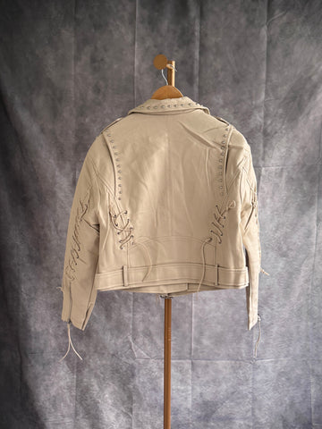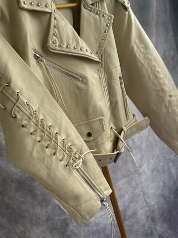 Cazadora de polipiel en color crema . Tachuelas y cremalleras en plateado. Cordón en las mangas .