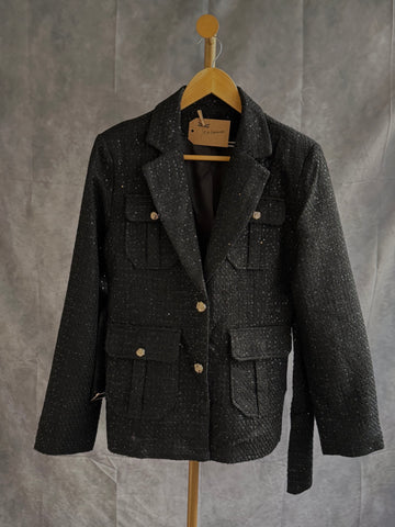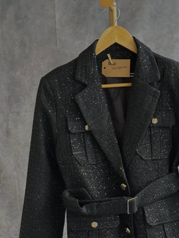Chaqueta de color negro con lentejuelas negras . Botones en dorado . Con cinturón a juego .60% poliéster 32% algodón 8% lana.