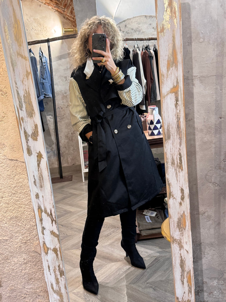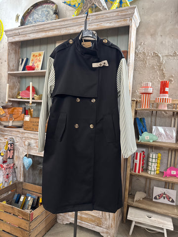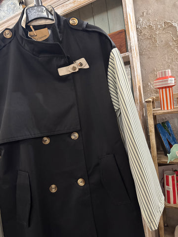 Gabardina con mangas de rayas . Cierre con botones y corchetes.