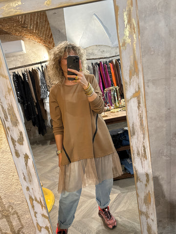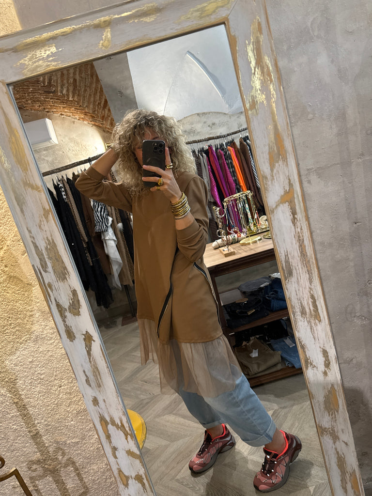 Sudadera larga en color marrón con detalles de cremalleras y tul . Talla Única .