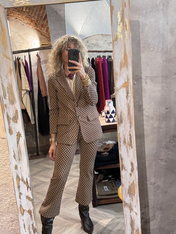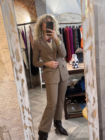 Traje chaqueta estampado geométrico. Chaqueta entallada y pantalones acampanados. 51% algodón 48% poliéster 1% elastano.
