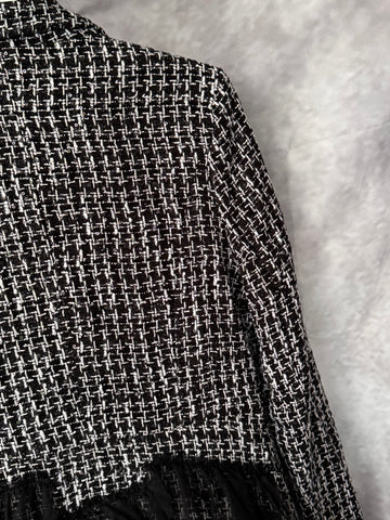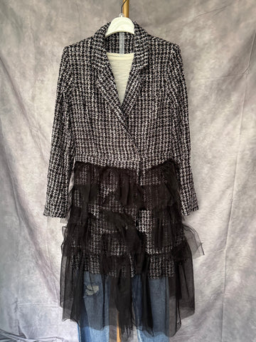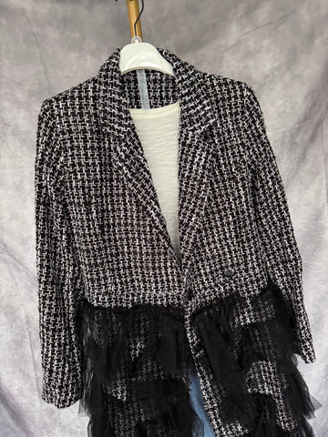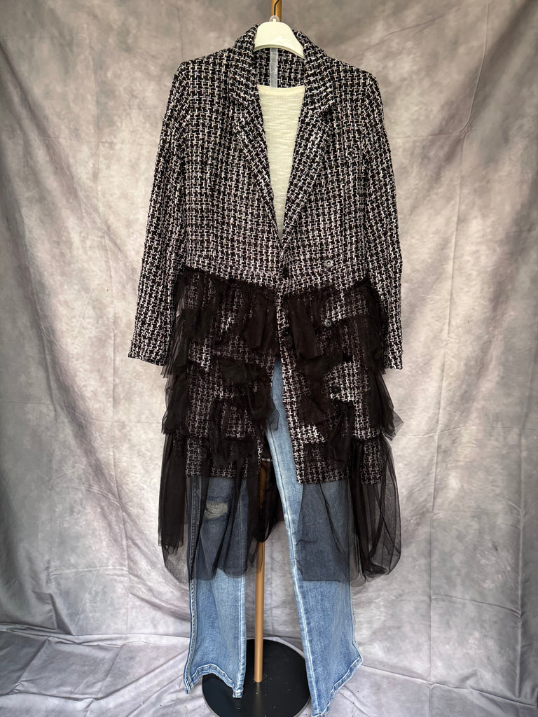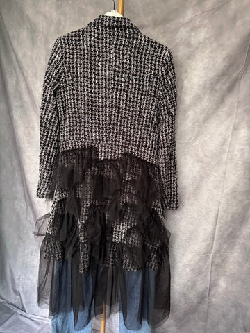 Abrigo de cuadros con lentejuelas y bajo de volantes en tul.
