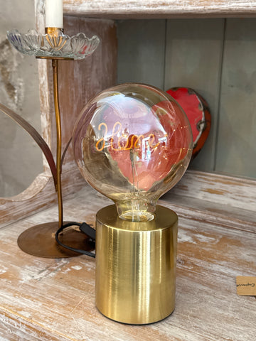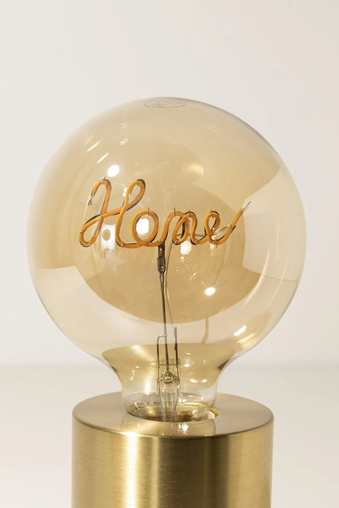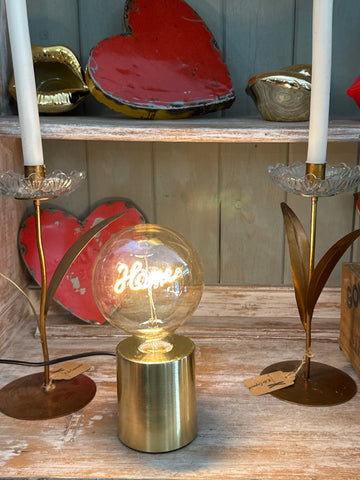 Lampara en metal color dorado con bombilla decorativa de gran tamaño con texto "HOME".