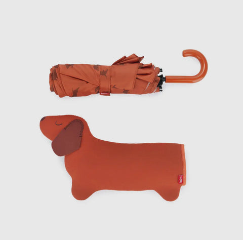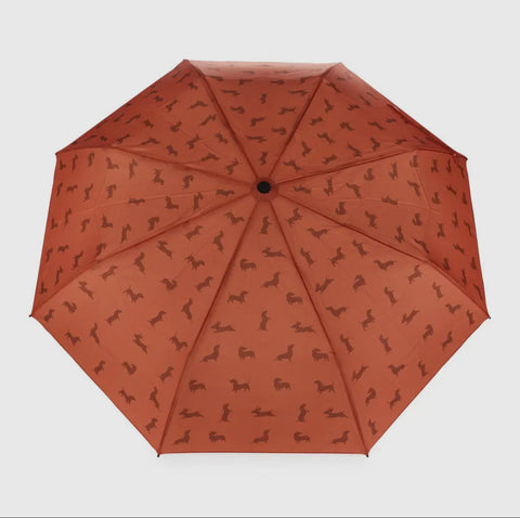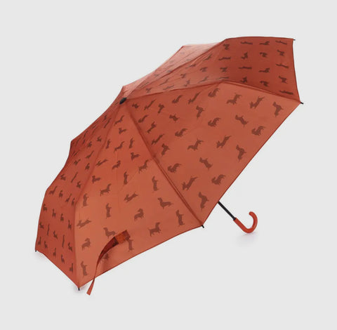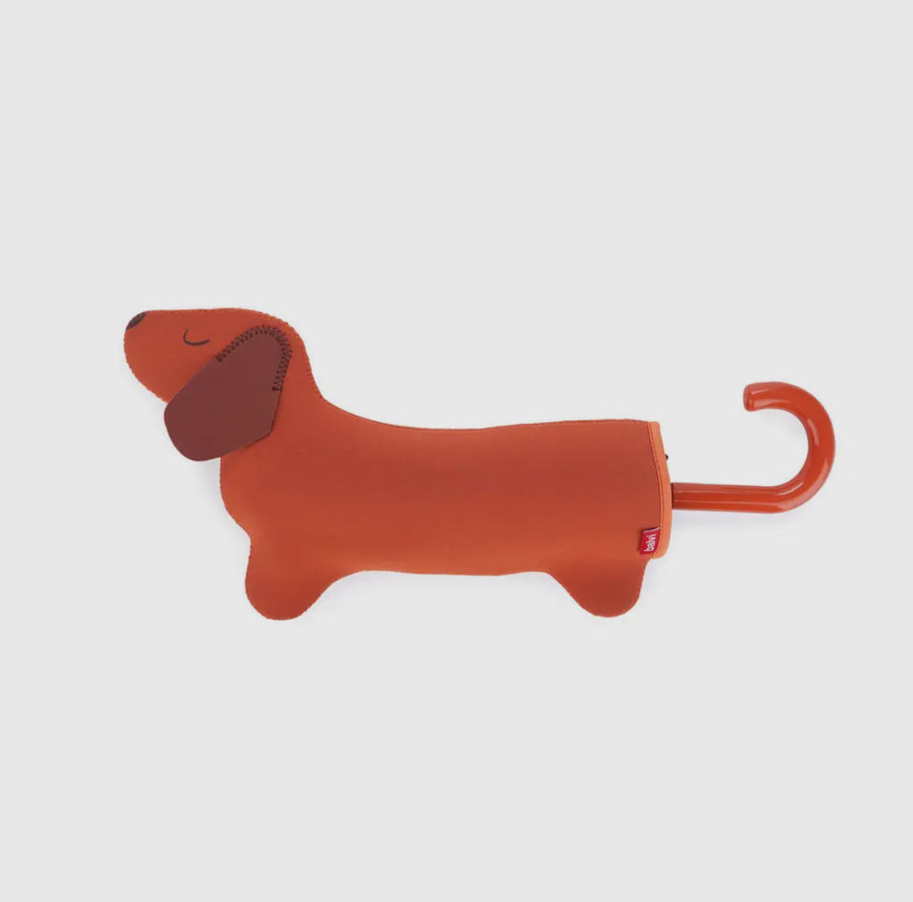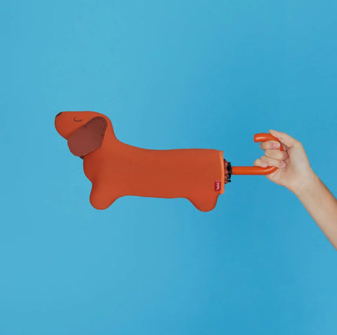 DISENO ORIGINAL. El paraguas tiene un patrón divertido de perros. La funda tiene forma de teckel y el mango simula la cola del animal cuando está cerrado.