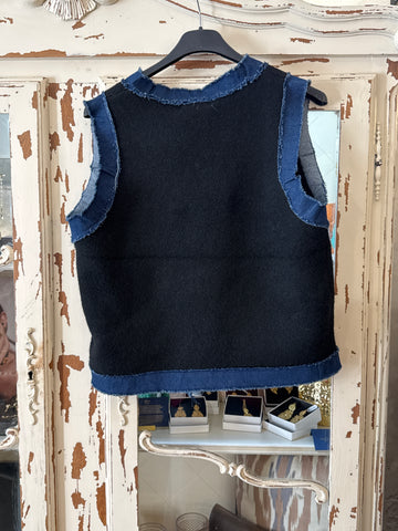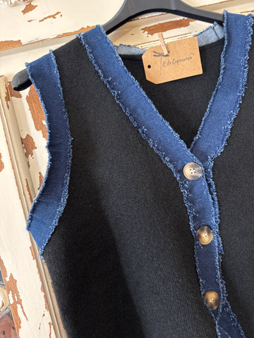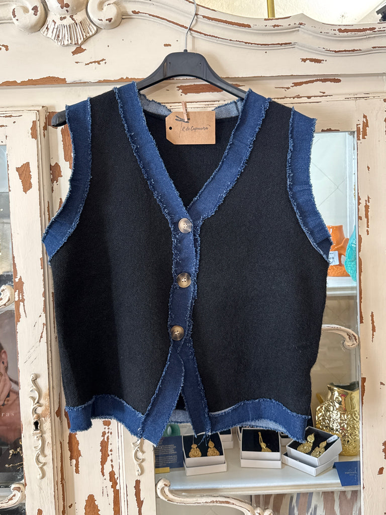 Chaleco de punto en color negro con remates en tela vaquera .