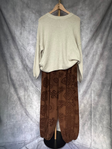 Pantalón bombacho estampado en tonos marrones . Cintura con cordón . Con bolsillos.