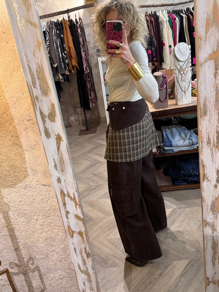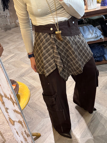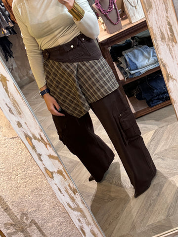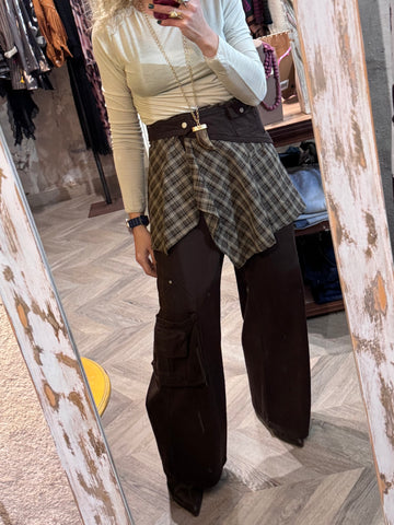 Vaquero cargo color marrón con sobrefalda de cuadros . La sobrefalda se puede quitar .