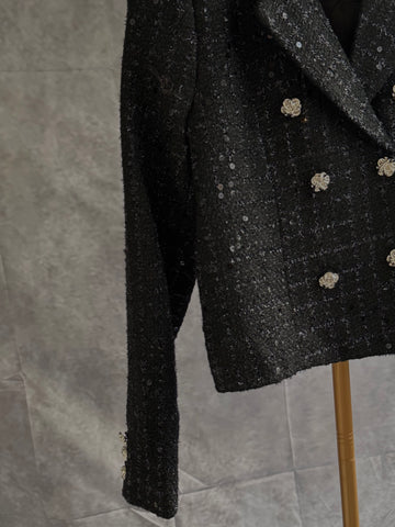 Chaqueta corta de color negro con lentejuelas negras . Botones en plateado.