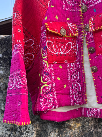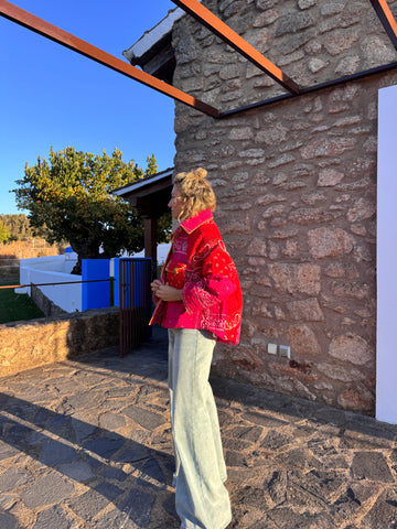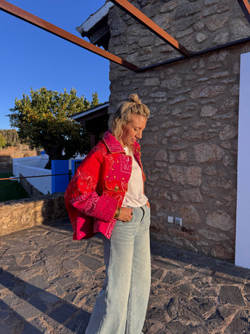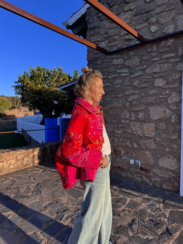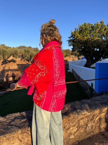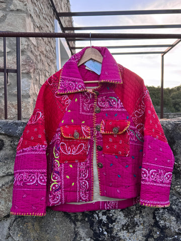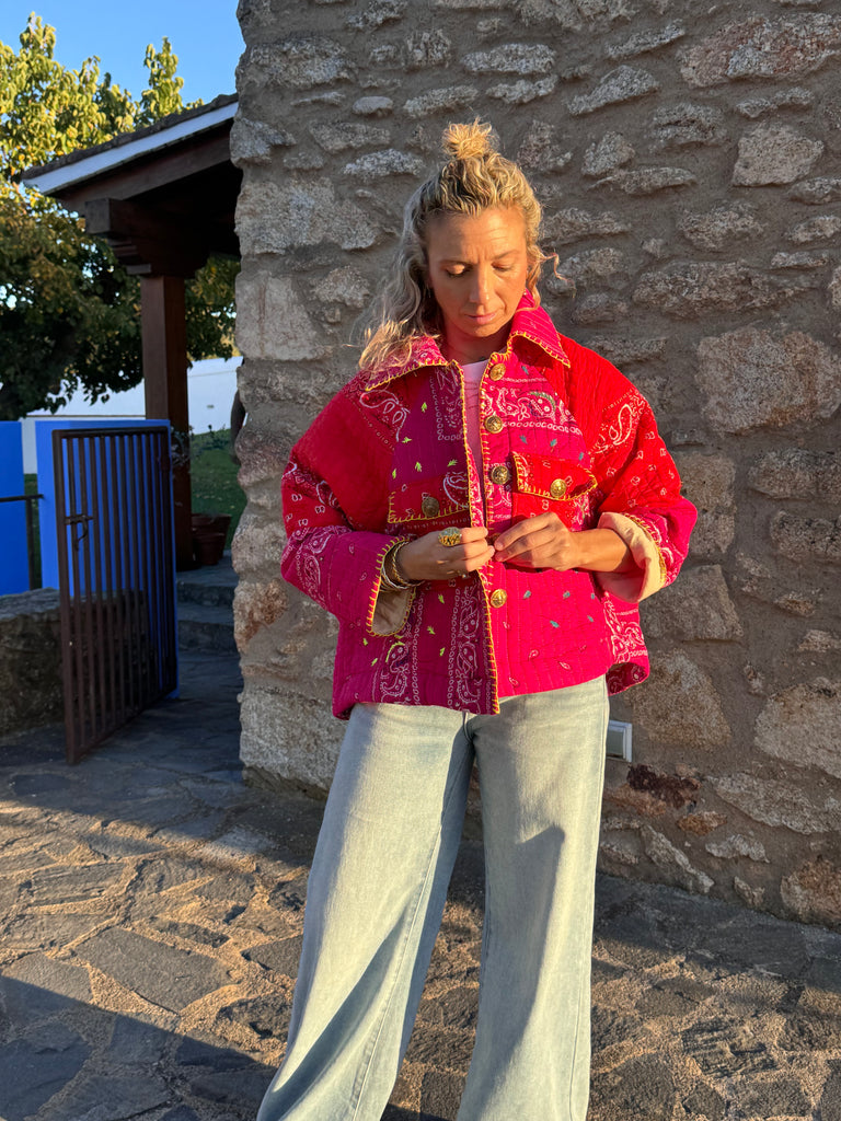 Cazadora acolchada de algodón con estampado bandada . Detalle de dibujos bordados y remates en cuello y mangas . Botones metálicos .
