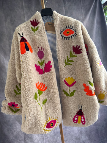Kimono de borreguito con bordados de colores . Forrado en tela de algodón de rayas . Con bolsillos.