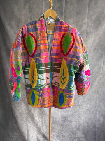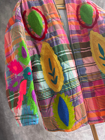 Kimono de cuadros con bordados de colores . Forrado en tela de algodón de rayas . Con bolsillos. Cinturón a juego .