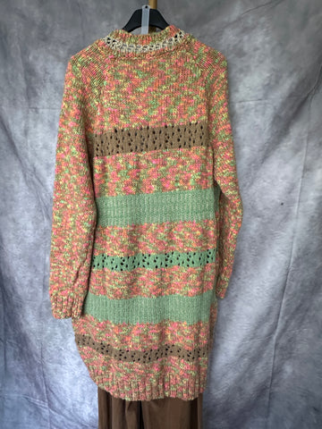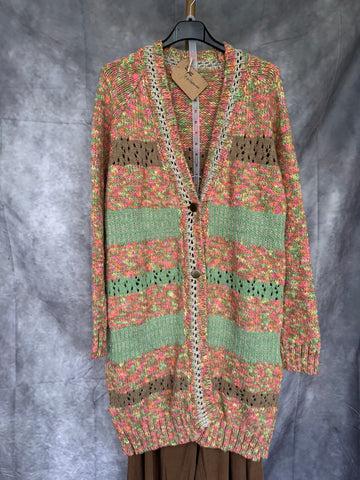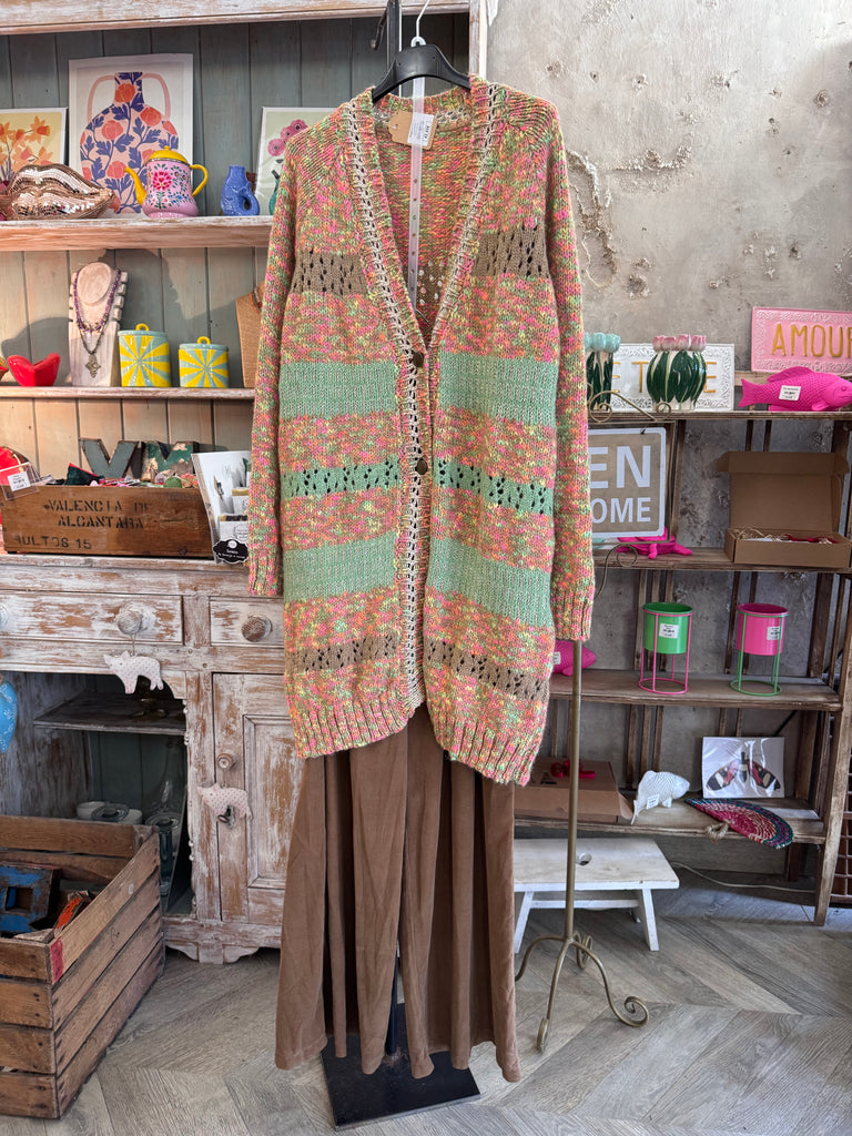 Chaqueta larga de punto en diferentes tonos con detalles en lurex.