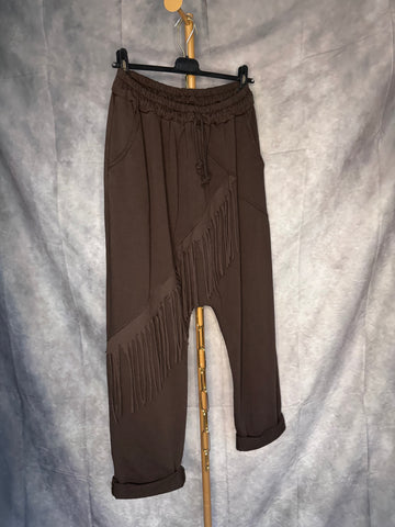 Pantalón baggy con flecos .Tejido tipo sudadera.Cintura elástico . Con bolsillos.